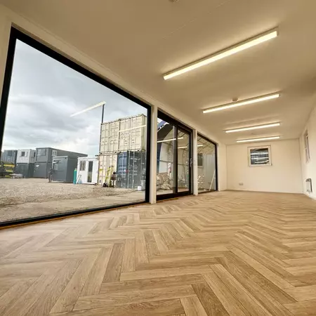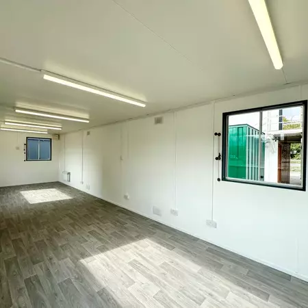 Contenedor oficina versátil 6x3m con aislamiento sándwich y climatización.